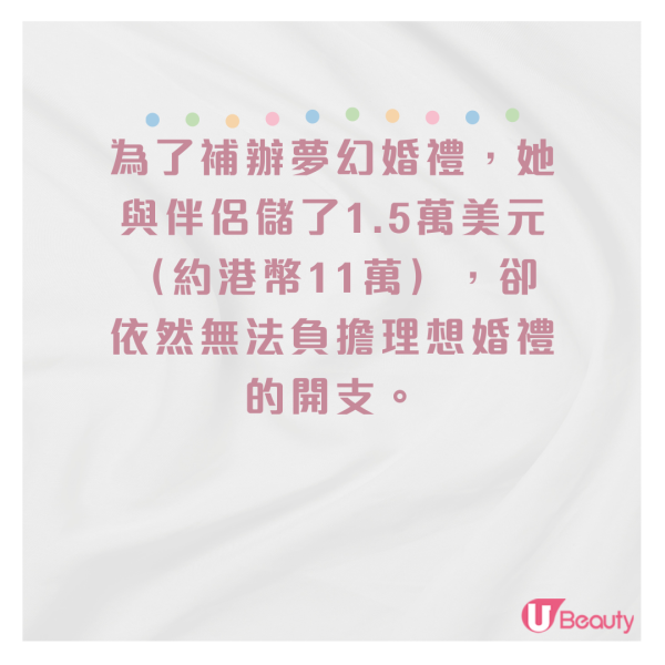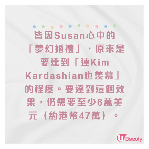 這個名為Susan的準新娘於自己的Facebook上發文抱怨朋友們破壞了她的終生美夢,結果被網友截圖分享。她於文中表示自己早在14歲就遇到一生摯愛,二人一同工作並暗生情愫,最後18歲便簽紙結婚,並於20歲生下第一個孩子。為了補辦夢幻婚禮,她與伴侶儲了1.5萬美元(約港幣11萬),卻依然無法負擔理想婚禮的開支。皆因Susan心中的「夢幻婚禮」,原來是要達到「連Kim Kardashian也羨慕」的程度。要達到這個效果,仍需要至少6萬美元(約港幣47萬)。