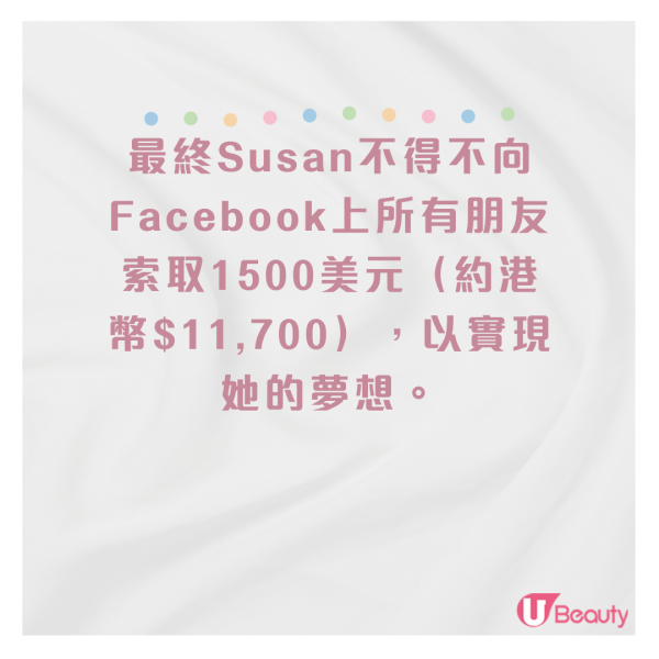 最終Susan不得不向Facebook上所有朋友索取1500美元(約港幣$11,700),以實現她的夢想。同時她也明確表示如果大家不捐款,就不能參加這個一生只有一次的特別婚禮,最終只有8個朋友願意參加。她無奈地宣布婚禮延期,並在募資網站GoFundMe募款,但卻只募到了250美元(約港幣$1,955),美夢最終粉碎。