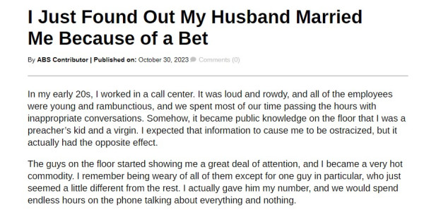 她在投稿中回顧20多年前在客服中心工作的日子,由於她是牧師的孩子,加上沒有戀愛經驗,使她成為年輕員工中的話題焦點。不過她對身邊的人卻沒有太大與趣,唯獨是現任老公。二人經過交往、結婚的歷程,現今已共度10年多了,一直相愛相親。