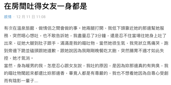 男友在Dcard以「在房間吐得女友一身都是」為題,發文分享他早前與女友在溫泉旅館做「情侶之間會做的事」。女友兩腿打開後,男友便慢慢低頭靠近女友為她服務,豈料女友下體的味道令他突然噁心想吐,強忍3分鐘後還是忍不住,最後吐在女友大腿到肚子以及手上。