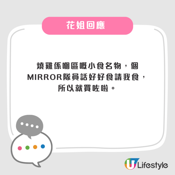 MIRROR 的經理人花姐近日在社交媒體上發布了一則關於「雞」的story,被認為影射 Frankie 的女友。對此,花姐今天親自作出回應,她解釋事緣當天她與 MIRROR一同前往新蒲崗進行舞台彩排,成員請吃燒雞: