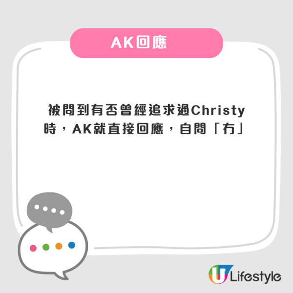 AK今日出席新歌宣傳活動時,就首度開腔回應有關近日Frankie女友的事件,被問到有否曾經追求過Christy時,AK就直接回應:
