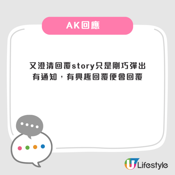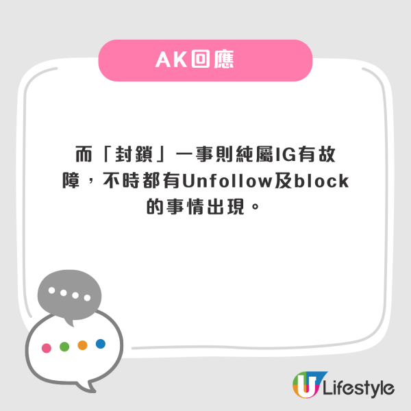 而另一張截圖就終於揭開「Christy被block」之謎,原來Frankie的女友Christy疑似被似乎被AK封鎖。從截圖顯示,Christy轉發了沈殷怡的帖文相片,,並寫道:「呢個大陸阿嬋樣既(嘅)三線奀星,逼ak block完我仲要特登黎睇我story宣示主權,收皮啦八婆,你條仔一直有偷食架onX」,直接爆了AK、沈殷怡的拍拖關係,並認為沈殷怡煽動了AK封鎖她。