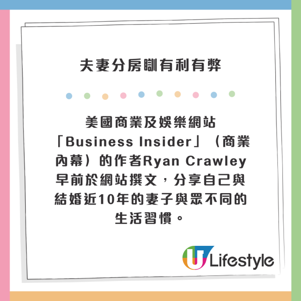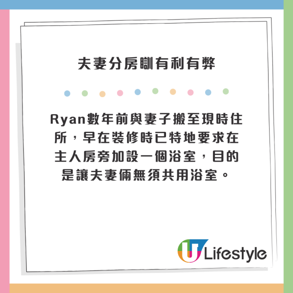 夫妻都十分滿意「分浴室」安排,Ryan曾打算更進一步,建議與妻子分房而睡,但就被對方拒絕。Ryan指「分房瞓」不僅令雙方可以有更多休息時間及私人空間,甚至對雙方睡眠質素亦有正面影響。他分享美國國家睡眠基金會2017年一項調查,發現當地有25%夫婦會選擇分房,
