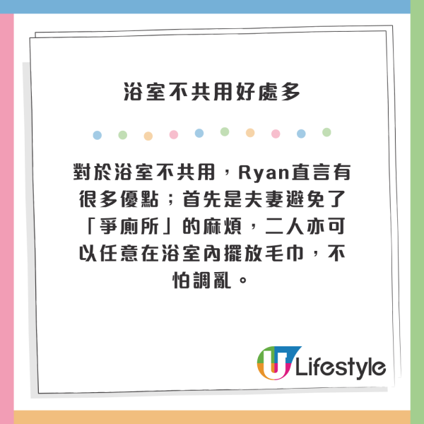 對於浴室不共用,Ryan直言有很多優點;首先是夫妻避免了「爭廁所」的麻煩,二人亦可以任意在浴室內擺放毛巾,不怕調亂。最令Ryan滿意的是他的浴室不會再擺滿各種洗頭水、護髮素及各種護膚產品,整個浴室整潔不少。