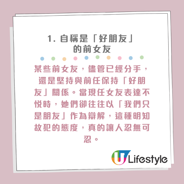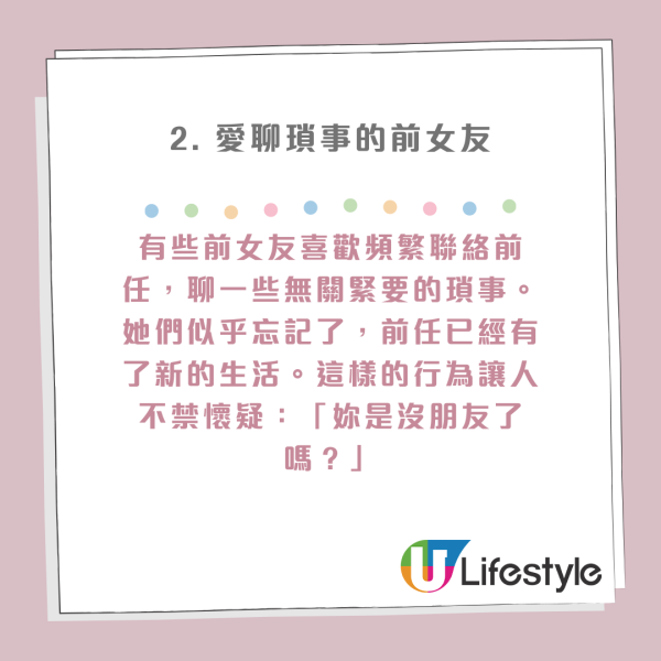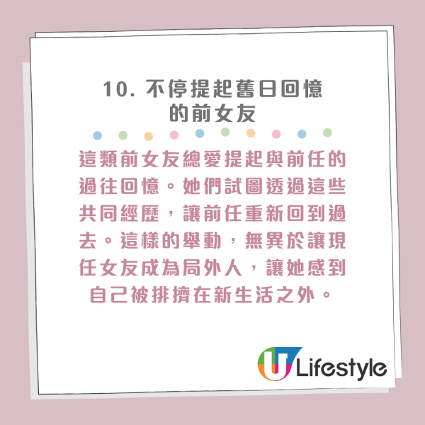 盤點Top 10最討人厭「男友的前女友」!對於很多女生來說,現任男友的前女友是個永遠要提防的對象。即便這位EX前度什麼都不做,僅僅是存在於過去,便能引起現任女友的警惕與不安。要是碰到那種邊界感薄弱的前女友,更是讓人火冒三丈。以下這10種前女友行為值得每位女生警惕,如果你不幸遇上,請拿出勇氣,保護好自己的幸福!