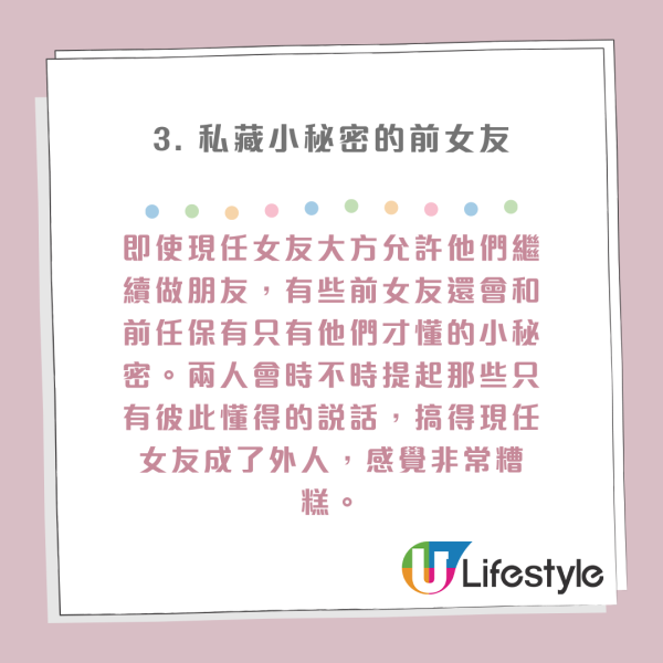 即使現任女友大方允許他們繼續做朋友,有些前女友還會和前任保有只有他們才懂的小秘密。兩人會時不時提起那些只有彼此懂得的說話,搞得現任女友成了外人,感覺非常糟糕。這樣的行為,不但無禮,還顯得自私,刻意讓現任難堪。
