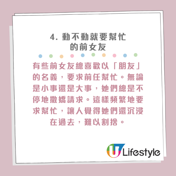 有些前女友總喜歡以「朋友」的名義,要求前任幫忙。無論是小事還是大事,她們總是不停地撒嬌請求。這樣頻繁地要求幫忙,讓人覺得她們還沉浸在過去,難以割捨。新生活應該由新的伴侶一同經歷,對前任的依賴,只會讓現任感到不適。