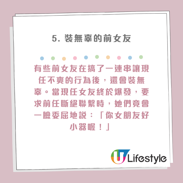 有些前女友在搞了一連串讓現任不爽的行為後,還會裝無辜。當現任女友終於爆發,要求前任斷絕聯繫時,她們竟會一臉委屈地說:「你女朋友好小器喔!」這種「扮無辜」的戲碼,只會讓人更討厭她們。尊重他人感受,才是成年人應有的態度。