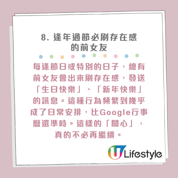 每逢節日或特別的日子,總有前女友會出來刷存在感,發送「生日快樂」、「新年快樂」的訊息。這種行為頻繁到幾乎成了日常安排,比Google行事曆還準時。這樣的「關心」,真的不必再繼續,否則只會讓現任感到心煩。