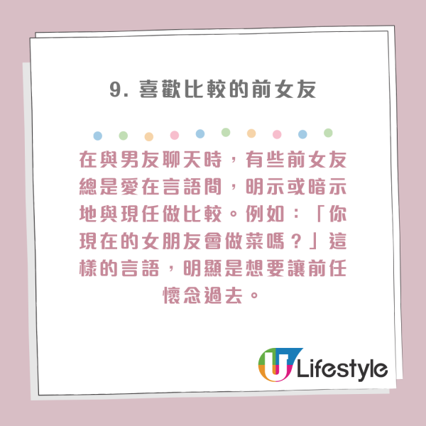在與男友聊天時,有些前女友總是愛在言語間,明示或暗示地與現任做比較。例如:「你現在的女朋友會做菜嗎?」這樣的言語,明顯是想要讓前任懷念過去。這種競爭心理不但不健康,還會給現任帶來困擾,讓前任難以安寧。