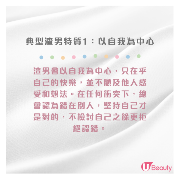 渣男亦非常懂得PUA,從你的容貌、穿搭,到性格、社交圈,他們都試圖掌控,並會貶低你來抬高自己,並透過這種行為來消除對方的自信心,讓你產生「除了他,誰都不會要你」的錯覺。同時喜歡控制和限制另一半,甚至會榨取另一半的所有價值,最常見的就是禁止另一半與「其他男性說話」、又或者是向另一半「借錢」。久而久之,你會在這段關係中感到身心俱疲,失去自我。