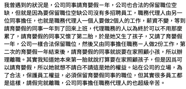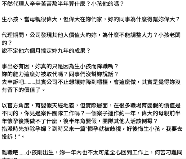 有大批網民見到事主的經歷後,紛紛大表認同,表示自己就算生完小朋友都不敢請育嬰假,避免「整爛飯碗」寧願即刻返工。亦有網民呼籲事主離職,認為公司已經沒有未來。不過亦有網民指出事出必有因,事主未必因為生小孩而降職,亦指代理人代了六個月的班,公司就看到代理人的表現也很合理。