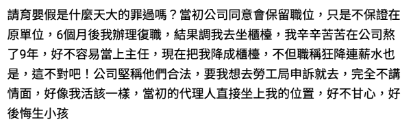 該網民表示自己在請假前,公司有協議好可以保留職位,但不保證在原本的部門。而她當初的主管職位是捱足9年才升到,如今因為生小朋友令到工作回還原到基本步,讓她感到不忿,大罵公司完全不體諒,但公司表示主張合法,就算去投訴都無問題。