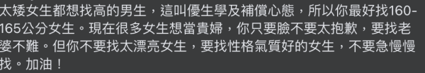 聽完之後可能會覺得簡直這個package好到爆,但仍然被這位可愛女生拒絕,皆因該男網民就身高只有1米62,讓他當場哭笑不得,「有史以來第一個因身高而被拒絕,所以到底是誰說錢可以彌補一切的。」有不少網民看完後的表示有可能女生家境也不錯,同時亦有人突破盲點,「確定是身高?不是長相?」。