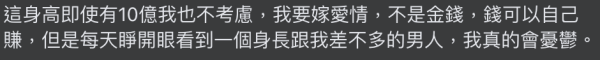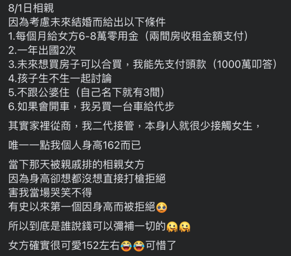 該男網民就表示家裡從商,自己亦接手家族的公司,名下有3間房子,但礙於工作關係加上性格內向,所以很少機會接觸女生。其後在親戚的介紹下就認識了一位身高1米52的女生,該男網民透露對方非常可愛,自己亦有意與對方進一步發展,同時開出了未來結婚給予另一半的條件。