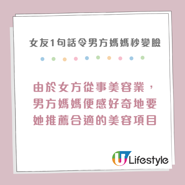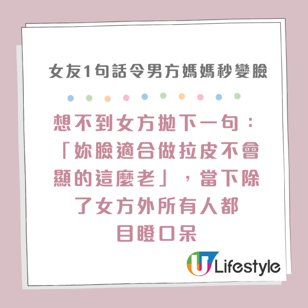由於女方從事美容業,男方媽媽便感好奇地要她推薦合適的美容項目,想不到女方拋下一句......讓當下除了女方外所有人都目瞪口呆,男方媽媽只能尷尬回應:「感覺很貴,我還是維持這樣好了」。到吃飯時間,作為大廚的男方爸爸禮貌地詢問各人飯菜是否合口味時,女方再次說話白目,男方爸爸聽到瞬間變臉,沒想到女方再補一刀,女方的無禮口氣令男方一家人都感到無語。
