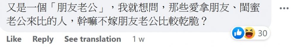 網民對此帖文反應相當兩極,有人不齒人妻拿朋友丈夫與自已己丈夫比較的行為,直言「幹嘛不嫁朋友老公比較乾脆」;又有人指出丈夫已將「薪水全部上繳」,還要「家事全包」,這位人妻肯定是有「公主病」。