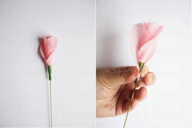 逐層逐層把花瓣(皺紙)貼上,平頭的部份向下、包著花莖。