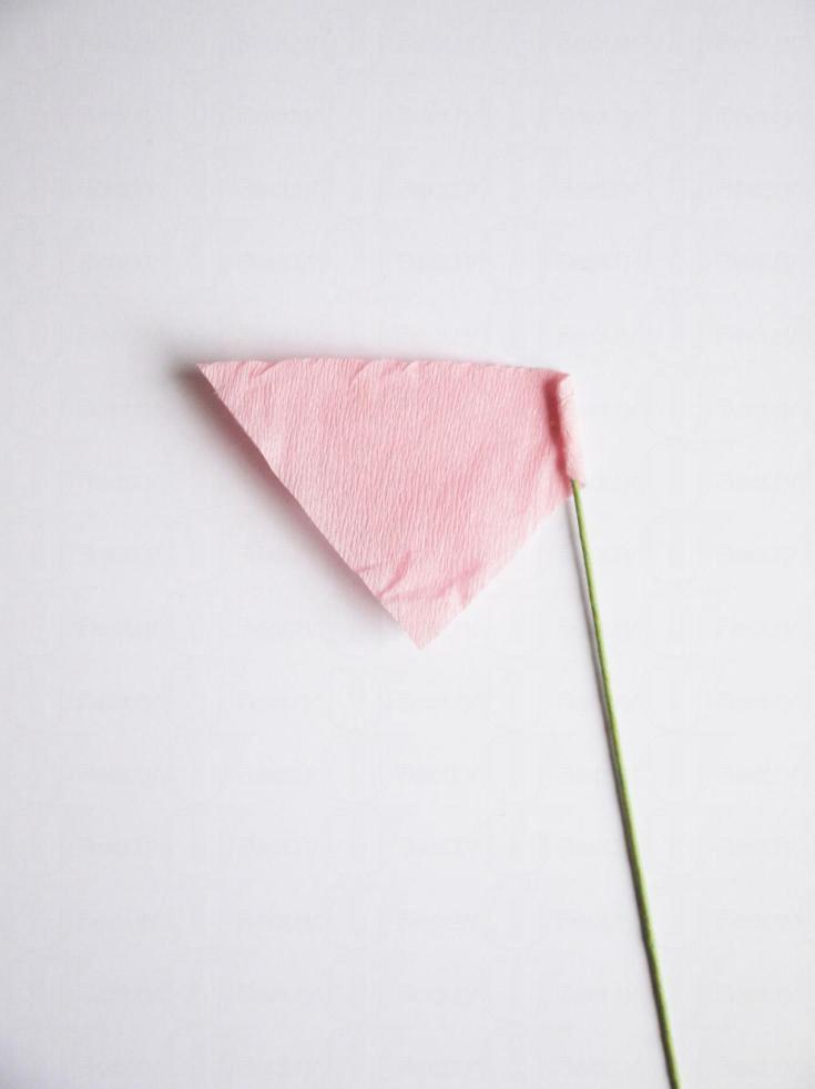 用雙面膠紙把皺紙的一角固定於綠色鐵線的一端上,餘下的皺紙圍著鐵線捲作花芯。