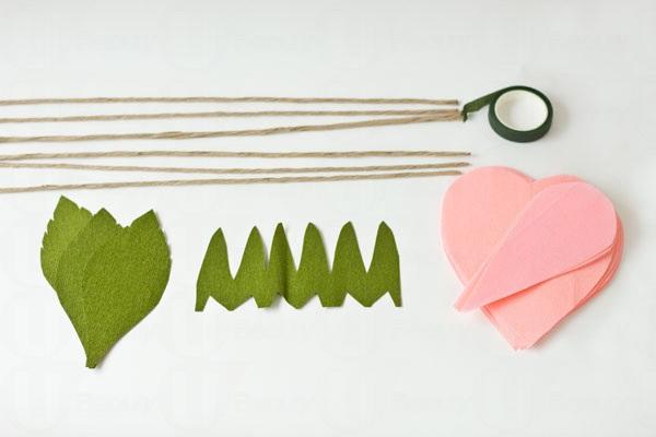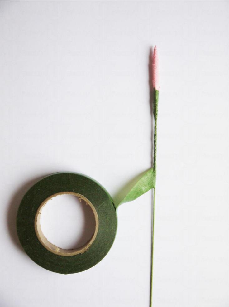 每加一塊花瓣就在底部用綠色膠帶包圍固定。花瓣的數量愈多,愈有層次感,愈好看!