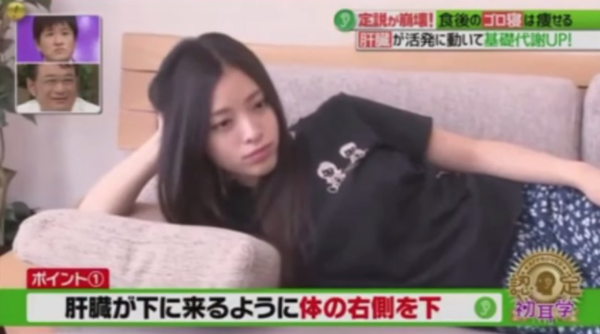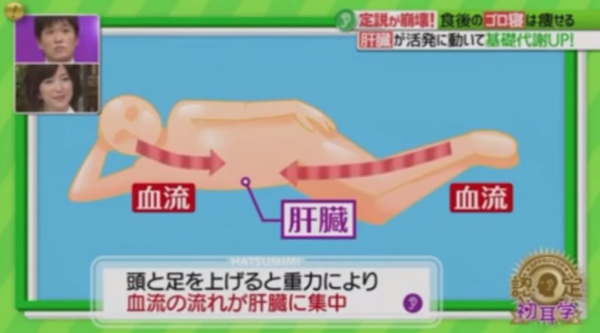 野村喜重郎醫生在節目中解釋,瘦身關鍵就是肝臟運作得好。肝臟是人體基礎代謝率最高的器官,如果肝臟血液循環好、運作越活躍,身體就越容易燒脂。食完一餐後,血液會由胃及腸流出,並匯集到肝臟,這個時候「躺下」可以幫助血液回流肝臟,讓肝臟全力運作,隨即開啟「躺平燒脂模式」!但重點是,必須要姿勢正確才可以達到效果!