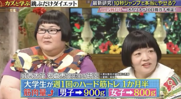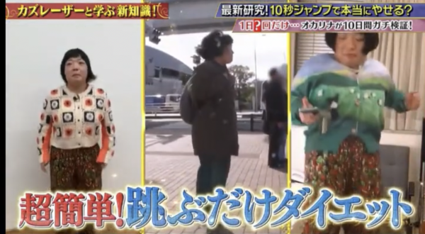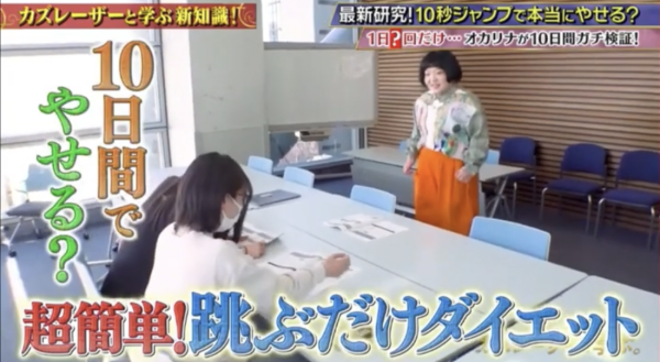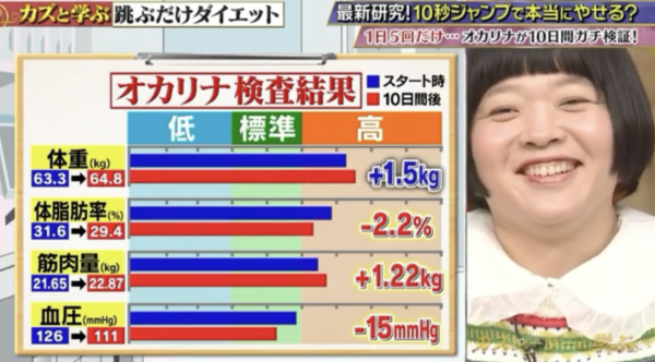 節目組找來日本搞笑藝人Okarina進行為期10天的真實測試。在這段期間,她除了每天進行 50 秒的原地跳外,生活作息與飲食基本上沒有任何限制,甚至可以任意進食。起初,Okarina 在節目中也充滿疑惑:「我每天只跳 50 秒,說實話,我有點懷疑這是否真的能幫我減肥。」不過,結果卻令人驚訝!雖然她的體重增加1.5kg,但體脂下降 2.2%、肌肉增加 1.22kg,血壓也下降了 15mmHg,效果非常明顯!連塚本浩醫生也驚呼實測結果非常成功,他表示:「以大學生的體格來進行高強度訓練,男性1.5個月僅增肌900g、女性則只是增肌800g。」再一次證實 Okarina 的結果驚人!