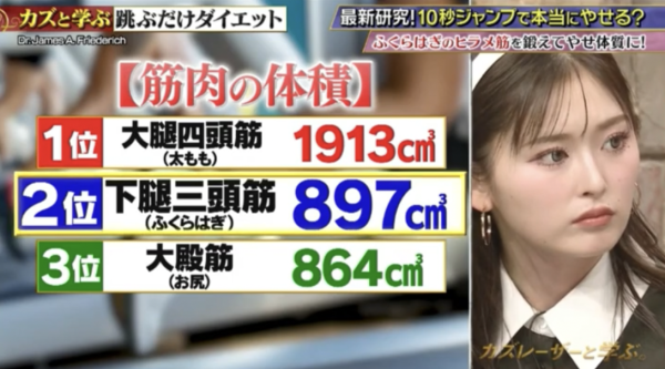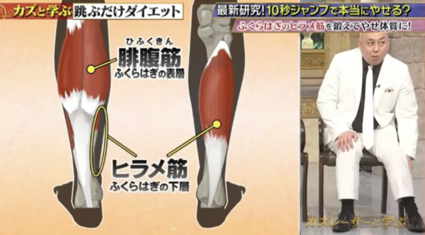 為什麼看似簡單的「原地跳」能有效消脂?筑波大學附屬醫院神經內科臨床教授塚本浩在節目中指出,持續活動小腿肌肉,能夠大幅加速全身的脂肪代謝率!能成功減重的最大功臣,全靠小腿的比目魚肌。比目魚肌中有超過 90% 的成分屬於慢縮肌纖維(慢肌),而慢肌的帶氧能力極高,能夠有效促進脂肪燃燒。不過,塚本浩醫生指出,單靠日常走路其實難以真正鍛鍊到這塊肌肉,因此他研發出每天跳躍 5 次、每次 10 秒的「原地跳減肥法」。他強調,這種「重複跳躍」的強度堪比跳繩,運動強度甚至比游泳、跑步還要高!此外,跳躍時產生的衝擊力還能減少腦內升壓蛋白,有助於降低血壓。
