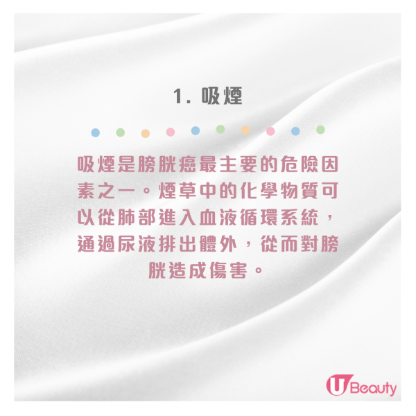 - 吸煙:吸煙是膀胱癌最主要的危險因素之一。煙草中的化學物質可以從肺部進入血液循環系統,通過尿液排出體外,從而對膀胱造成傷害。