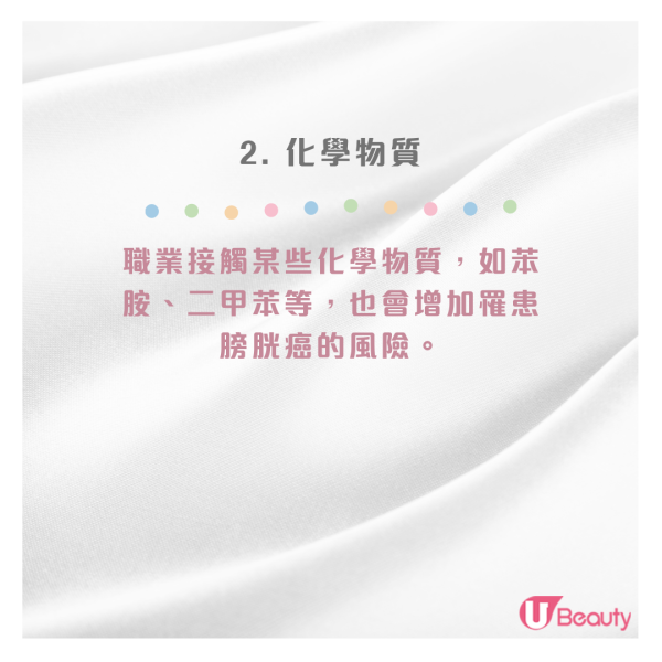 - 化學物質:職業接觸某些化學物質,如苯胺、二甲苯等,也會增加罹患膀胱癌的風險。