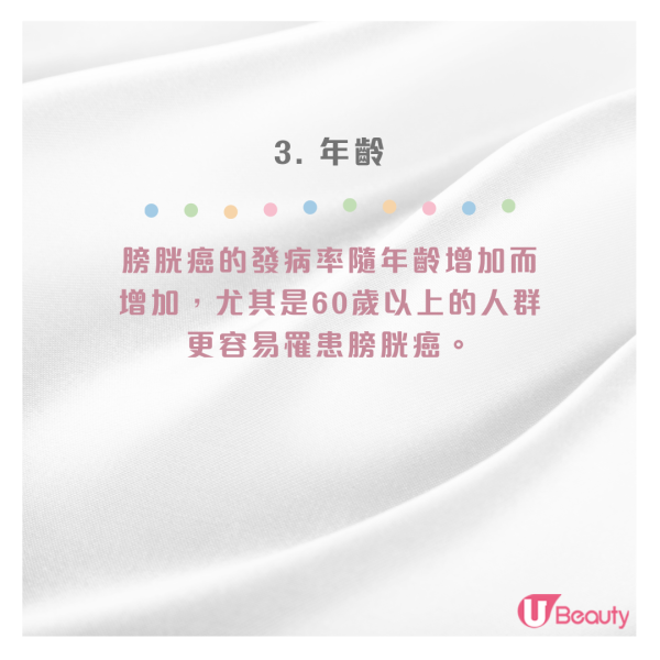 - 年齡:膀胱癌的發病率隨年齡增加而增加,尤其是60歲以上的人群更容易罹患膀胱癌。