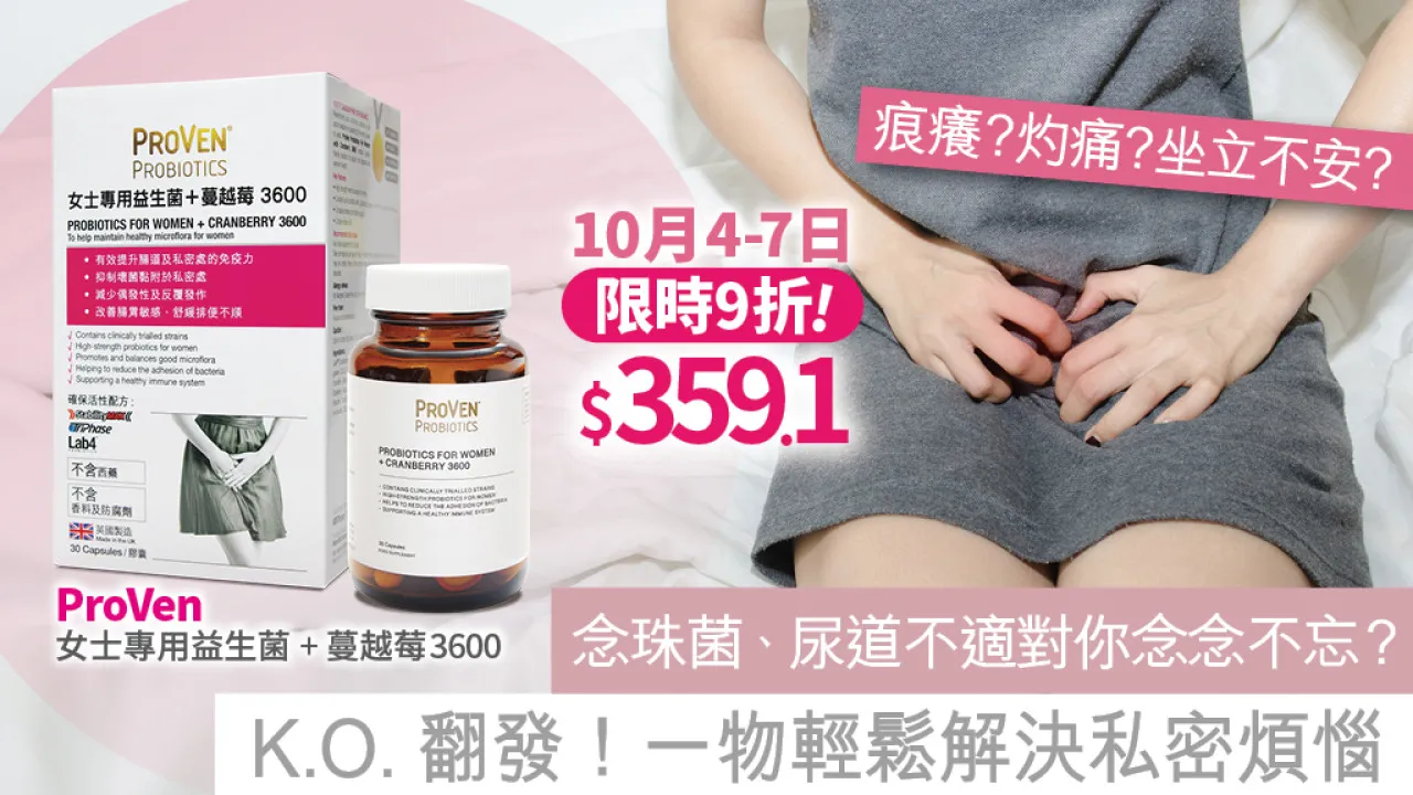 春夏蚊叮蟲咬、秋冬皮膚乾燥,又痕又腫,以為咁樣已經好難受?一旦受念珠菌及尿道炎困擾,痕癢、異味、紅腫甚至灼痛同時間襲來,令人坐立不安、渾身難受,箇中感受相信不少女生都親身經歷過。事實上,念珠菌感染、尿道炎等私密不適很常見,全球近75%女性曾遇私密不適,曾經歷復發的更高達45%!正因其常見,女生們要享受優質生活,就要想盡辦法改善私密健康。「ProVen女士專用益生菌+蔓越莓3600」雙效配方,一邊以益生菌提升免疫力、一邊添加蔓越莓穩定私密處酸鹼值,益菌增加、惡菌bye bye,輕鬆K.O.翻發煩惱!10月4至17日設限時9折優惠,立即為自己及身邊姊妹入貨啦!