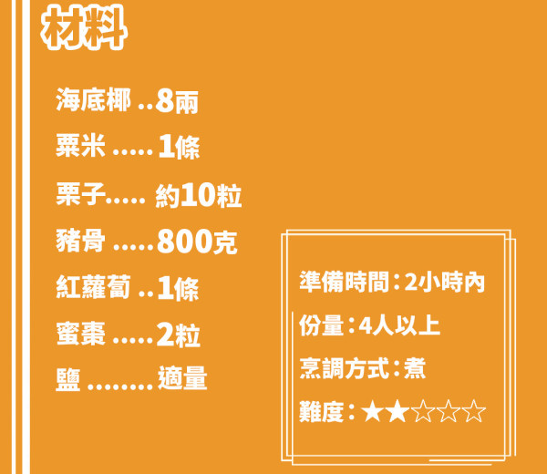 秋冬天氣乾燥,海底椰有止咳潤肺的功效,配合栗子和紅蘿蔔煲湯,有助解決乾燥引起的喉痛不適,更可潤膚養顏,是個簡單易煲的秋天湯水。