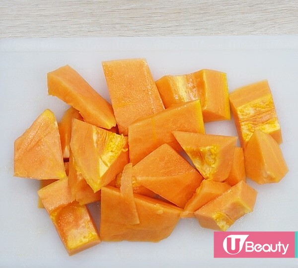 - 木瓜去皮去籽切成塊狀,新鮮百合剝成片狀及去除根部黑色的部分,備用