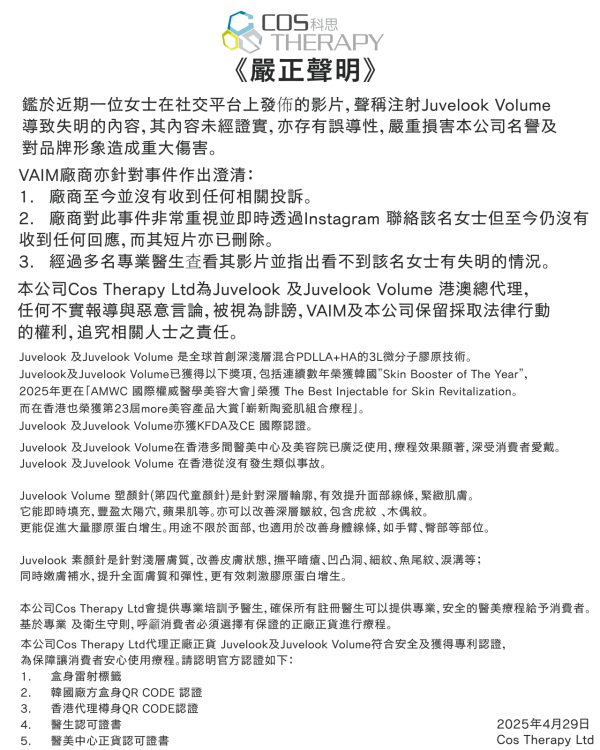 早前一名美籍韓裔女生在社交媒體聲清在韓國接受醫美注射後導致失明的經歷,事件令人震驚,Juvelook及Juvelook Volume港澳區總代理即發表《嚴正聲明》表示內容未經證實 ,亦在事件發生後即透過Instagram聯絡該名女士但至今仍沒有收任何回應。