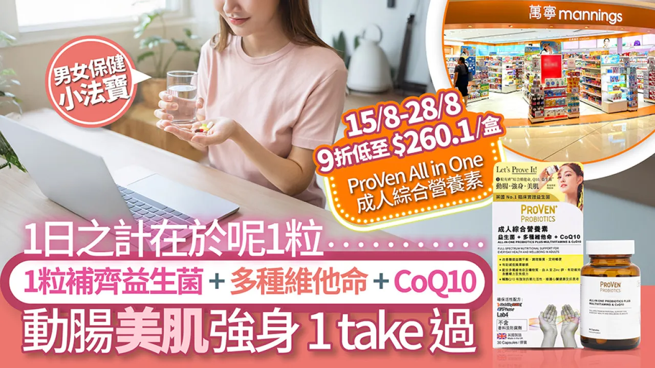 相比空肚食早餐,現在更多人從一朝早就服用大量supplement,每天3餐狂吞各種維他命及補充藥丸,吃得比正餐還講究。不過當中又有不少人常常因為補充劑種類繁多又經常忘記依時服用,往往半途而廢。為了健康就要付出?但付出也有聰明方法,1粒All-in-One益生菌就能補充全日所需,同時做到動腸、美肌、強身,再忙也能輕鬆保持健康!「ProVen All-in-One成人綜合營養素」限時9折優惠不能錯過!