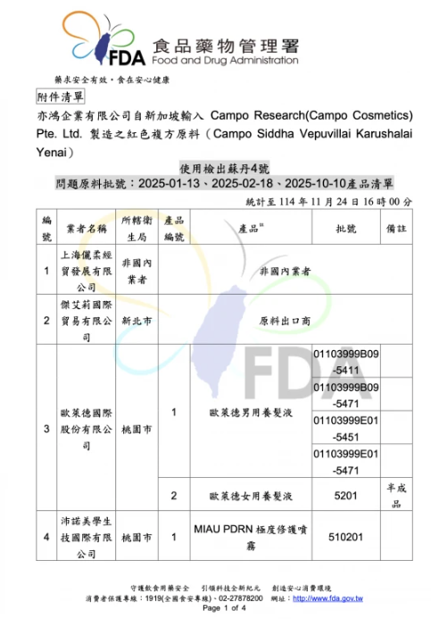 這波化妝品蘇丹紅事件的源頭,經追查指向台灣「亦鴻企業有限公司」從新加坡 Campo Research 進口的「紅色複方(Campo Siddha Vepuvillai Karushalai Yenai)」原料。該原料被檢出含有禁用色素「蘇丹四號 (Sudan IV)」,而這款原料過去曾主打「天然植物萃取」,導致多家下游業者在不知情的情況下使用。