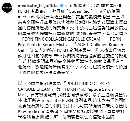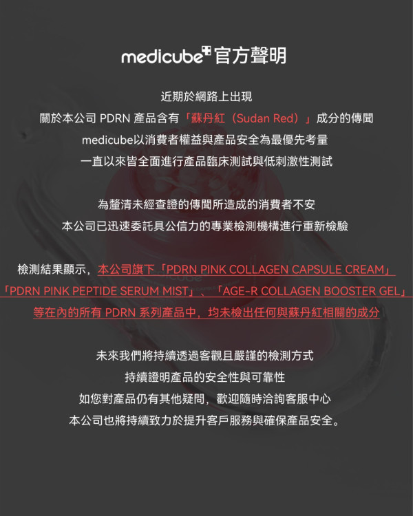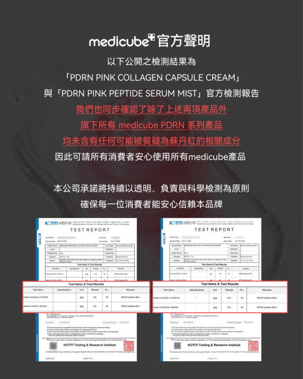 不少網民日前透過 CosDNA 等資料庫檢查成分後整合出一份疑似有蘇丹紅成分的產品名單,當中更包括不少人氣的日韓品牌產品,韓國人氣品牌Medicube、UNOVE兩個品牌已率先作出回應,並火速公開第三方權威檢測報告,證實旗下產品均未驗出蘇丹紅成分。