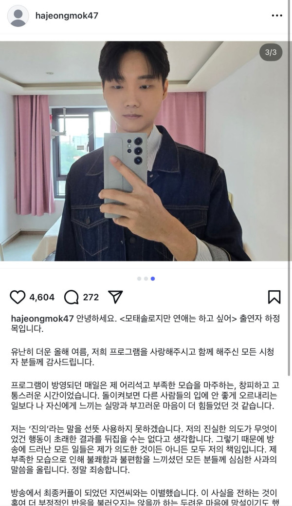 我和在節目中成為最終情侶的志軟小姐分手了。雖然曾因害怕公布這個消息會引發更負面的反應而有所猶豫,但我認為這對喜愛本節目的觀眾們來說是不禮貌的。對於支持我們的朋友們,我感到非常抱歉。
