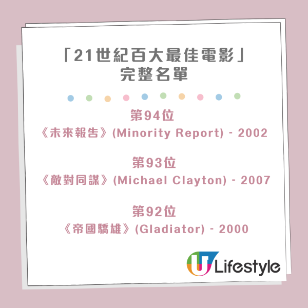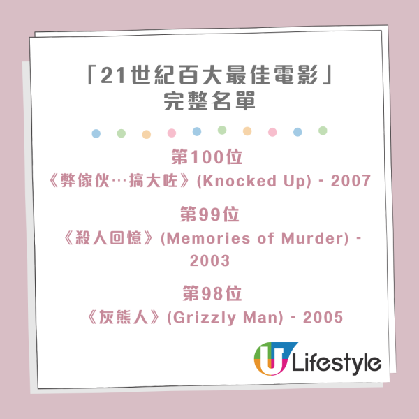 《紐約時報》發布了一份極具份量的「21世紀百大最佳電影」片單,邀請了超過五百位業界頂尖人士,為過去二十多年的光影歲月進行一次全面的回顧與總結。片單中,由南韓導演奉俊昊執導的《上流寄生族》均榮登榜首,成為影評人與觀眾的一致首選。緊隨其後的經典作品有大衛連治的《穆荷蘭大道》(Mulholland Drive)和保羅湯瑪斯安德遜的《黑金企業》(There Will Be Blood) 。