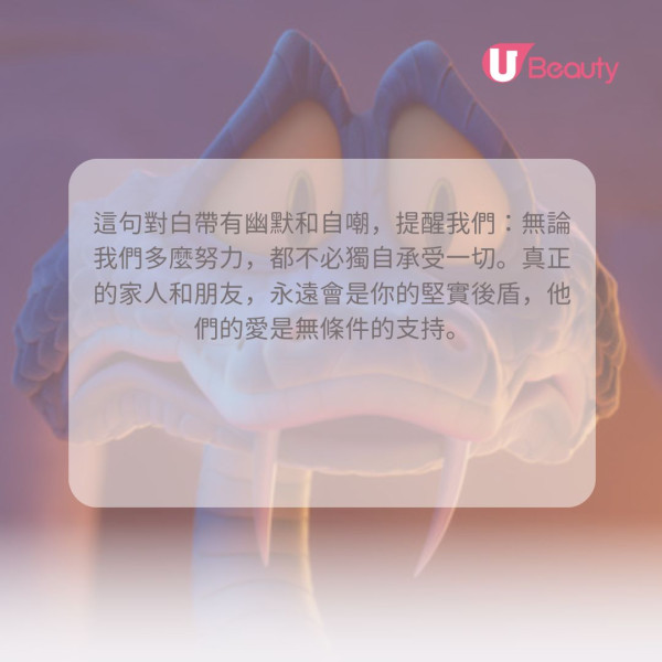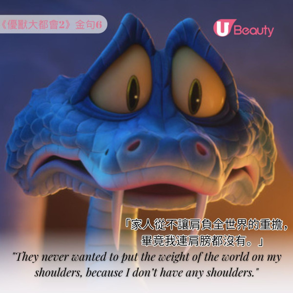 《優獸大都會2》金句6: 「家人從不讓肩負全世界的重擔,畢竟我連肩膀都沒有。」