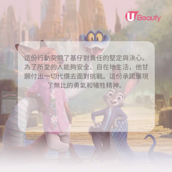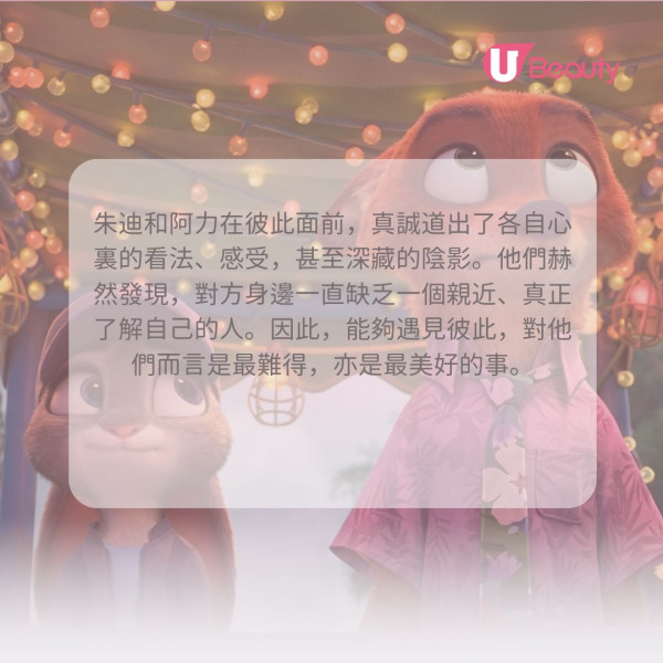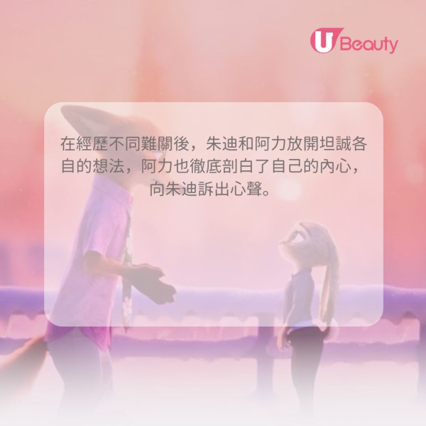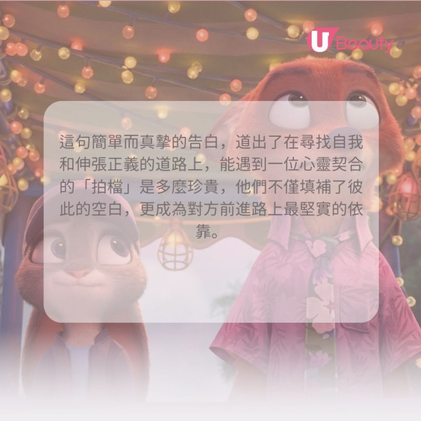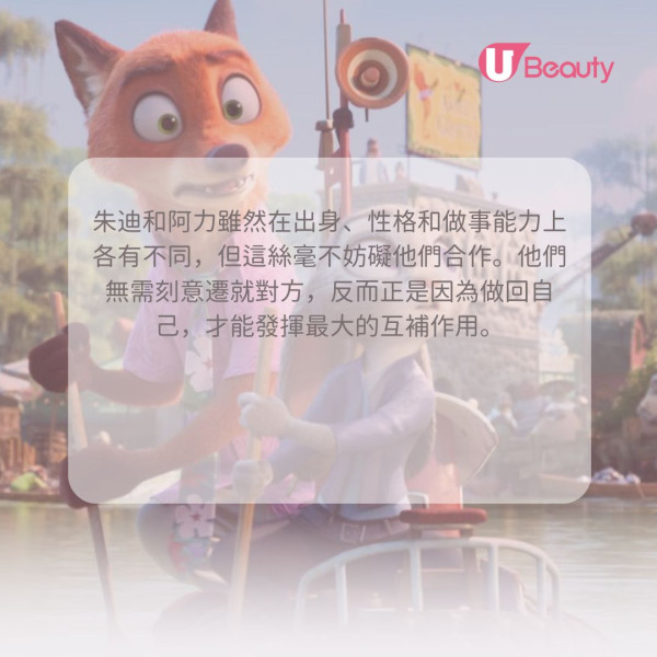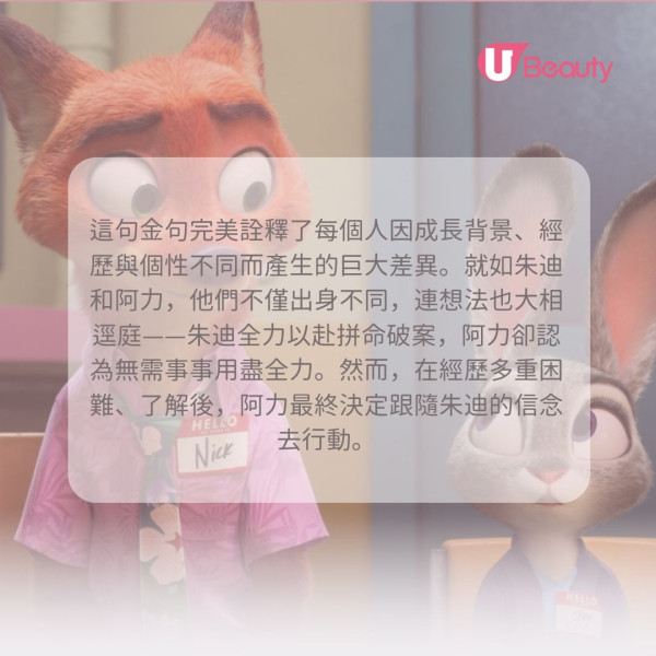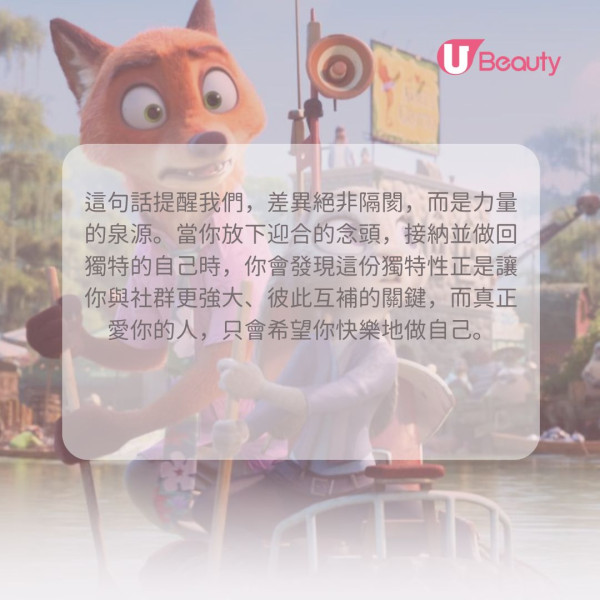朱迪和阿力雖然在出身、性格和做事能力上各有不同,但這絲毫不妨礙他們合作。他們無需刻意遷就對方,反而正是因為做回自己,才能發揮最大的互補作用。這句話提醒我們,差異絕非隔閡,而是力量的泉源。當你放下迎合的念頭,接納並做回獨特的自己時,你會發現這份獨特性正是讓你與社群更強大、彼此互補的關鍵,而真正愛你的人,只會希望你快樂地做自己。