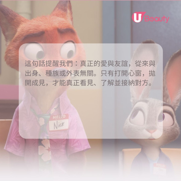 這句金句完美詮釋了每個人因成長背景、經歷與個性不同而產生的巨大差異。就如朱迪和阿力,他們不僅出身不同,連想法也大相逕庭——朱迪全力以赴拼命破案,阿力卻認為無需事事用盡全力。然而,在經歷多重困難、了解後,阿力最終決定跟隨朱迪的信念去行動。這句話提醒我們:真正的愛與友誼,從來與出身、種族或外表無關。只有打開心窗,拋開成見,才能真正看見、了解並接納對方。