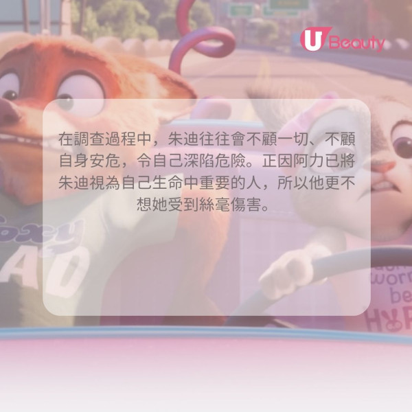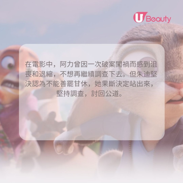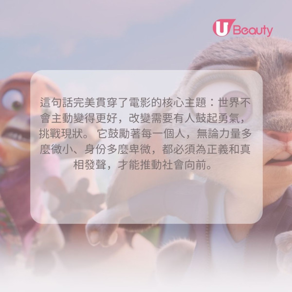在電影中,阿力曾因一次破案闖禍而感到沮喪和退縮,不想再繼續調查下去。但朱迪堅決認為不能善罷甘休,她果斷決定站出來,堅持調查,討回公道。這句話完美貫穿了電影的核心主題:世界不會主動變得更好,改變需要有人鼓起勇氣,挑戰現狀。 它鼓勵著每一個人,無論力量多麼微小、身份多麼卑微,都必須為正義和真相發聲,才能推動社會向前。