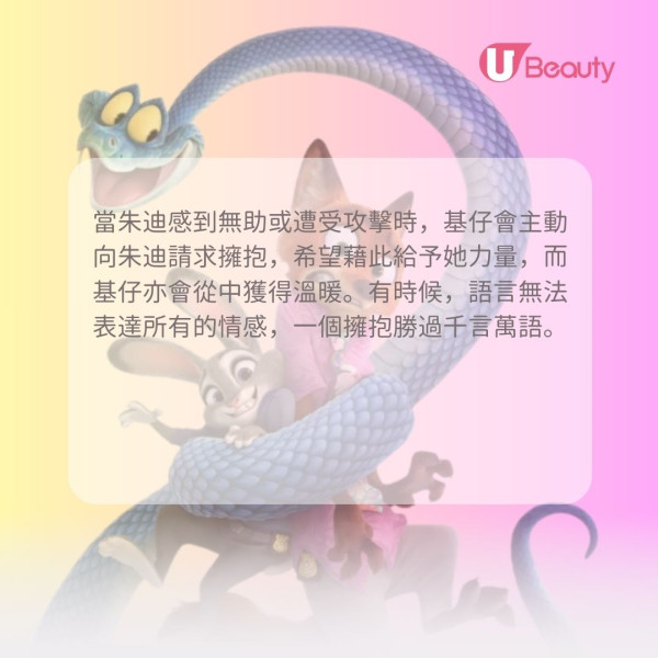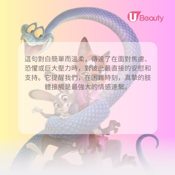 當朱迪感到無助或遭受攻擊時,基仔會主動向朱迪請求擁抱,希望藉此給予她力量,而基仔亦會從中獲得溫暖。有時候,語言無法表達所有的情感,一個擁抱勝過千言萬語。這句對白簡單而溫柔,傳達了在面對焦慮、恐懼或巨大壓力時,對彼此最直接的安慰和支持。它提醒我們,在困難時刻,真摯的肢體接觸是最強大的情感連繫。
