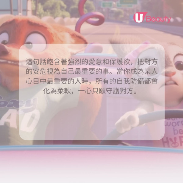 在調查過程中,朱迪往往會不顧一切、不顧自身安危,令自己深陷危險。正因阿力已將朱迪視為自己生命中重要的人,所以他更不想她受到絲毫傷害。這句話飽含著強烈的愛意和保護欲,把對方的安危視為自己最重要的事。當你成為某人心目中最重要的人時,所有的自我防備都會化為柔軟,一心只願守護對方。