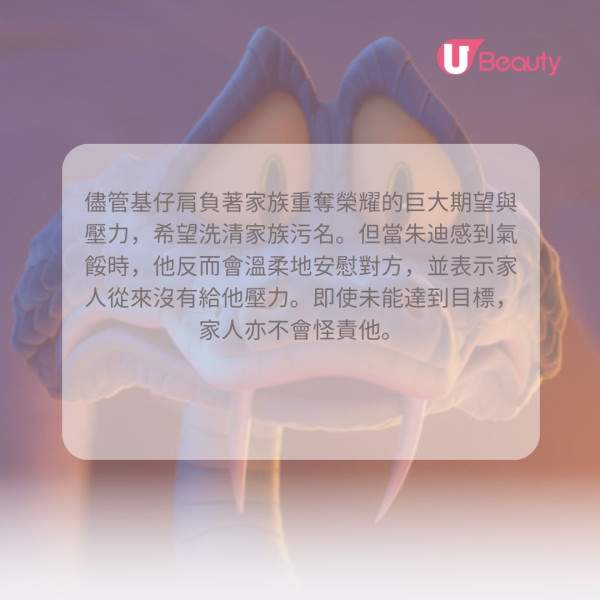 儘管基仔肩負著家族重奪榮耀的巨大期望與壓力,希望洗清家族污名。但當朱迪感到氣餒時,他反而會溫柔地安慰對方,並表示家人從來沒有給他壓力。即使未能達到目標,家人亦不會怪責他。這句對白帶有幽默和自嘲,提醒我們:無論我們多麼努力,都不必獨自承受一切。真正的家人和朋友,永遠會是你的堅實後盾,他們的愛是無條件的支持。