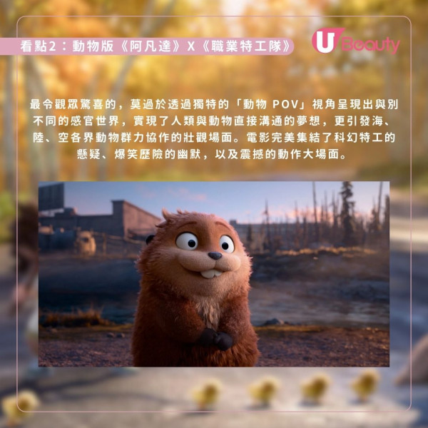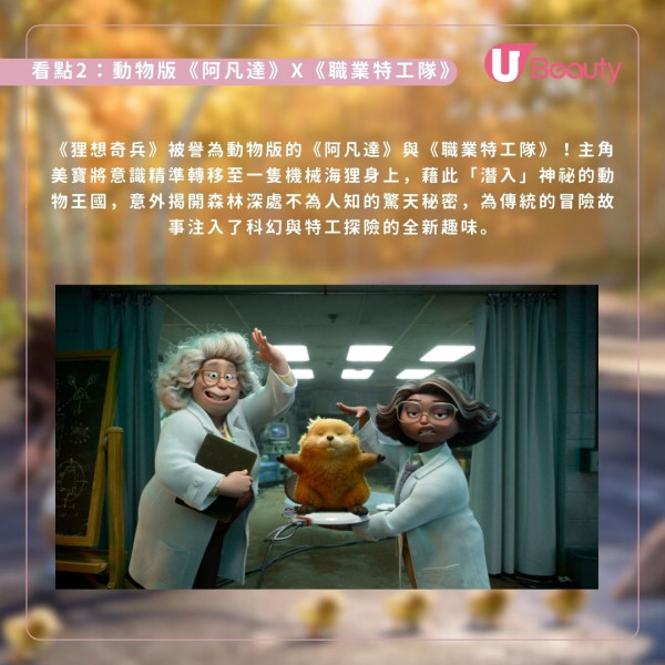 被譽為動物版《阿凡達》聯乘《職業特工隊》的《狸想奇兵》,講述少女美寶透過意識轉移技術化身機械海狸潛入動物王國,在獨特的「動物 POV」視角與海陸空協作下,展開一場集結科幻特工與爆笑歷險的拯救自然壯闊冒險。