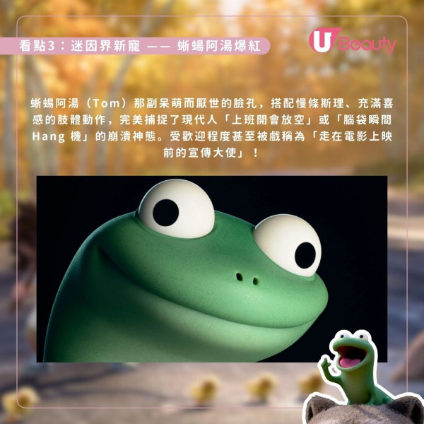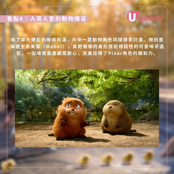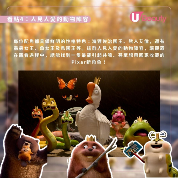 除了爆紅的蜥蜴Tom,片中還有哨牙萌爆的海狸美寶、威嚴的佐治國王及憨厚的熊人艾倫等一眾性格鮮明的動物角色,這群造型獨特、人見人愛的陣容必將誕生觀眾最愛的Pixar新寵。