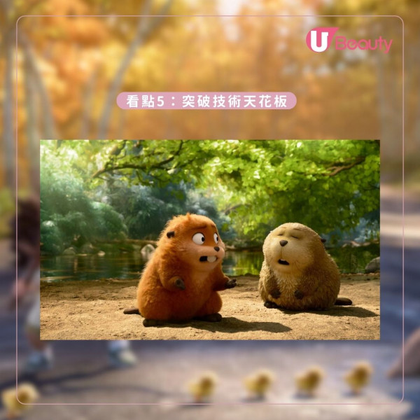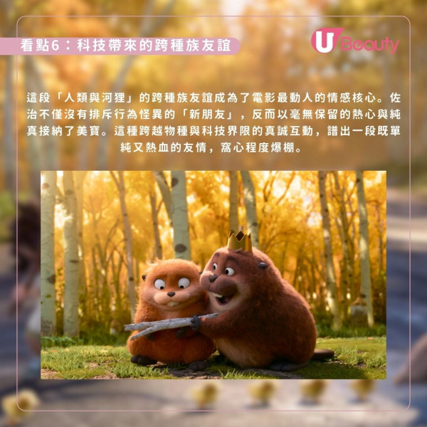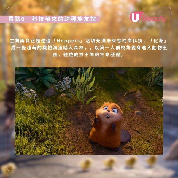 電影透過前瞻性的「Hoppers」技術,意識轉移技術打破物種隔閡,讓化身機械海狸的美寶與純真河狸國王佐治建立起跨越科技界限、既熱血又窩心的跨種族友誼。